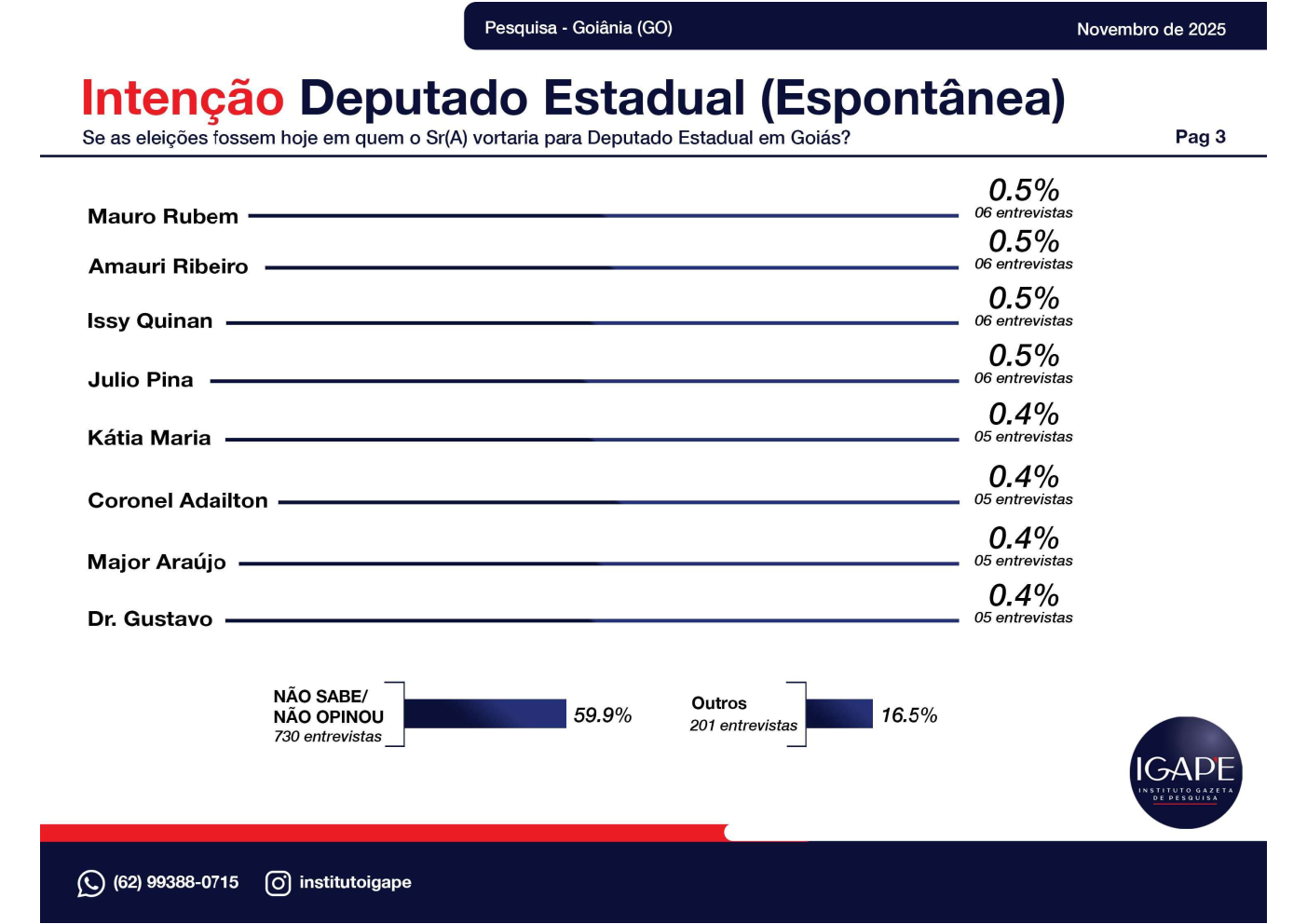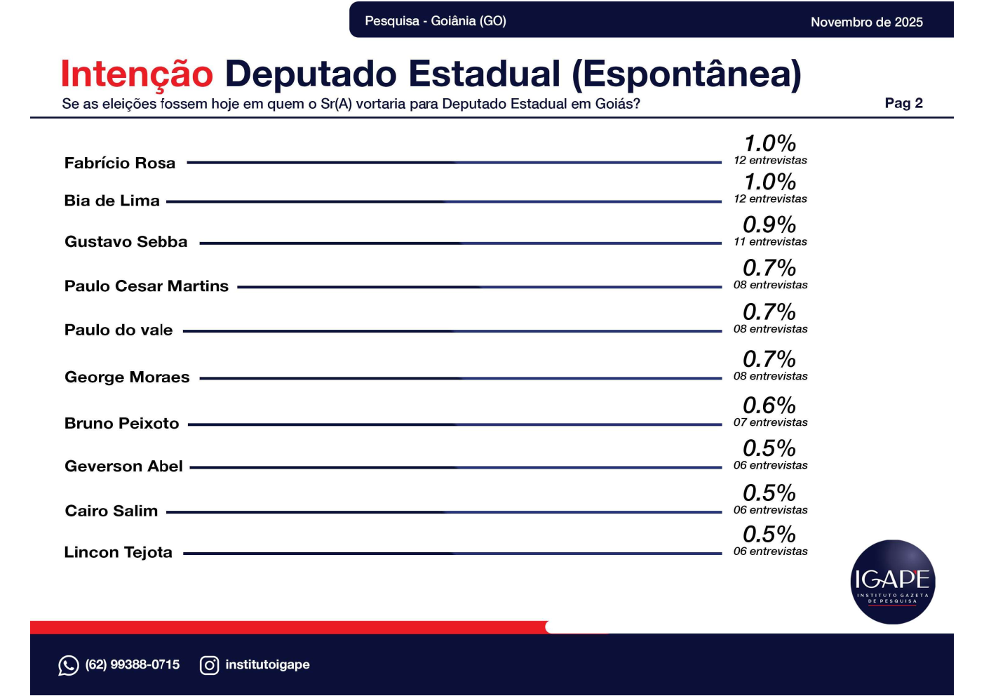 A pesquisa do IGAPE mostra que a corrida eleitoral para a Assembleia Legislativa já começou e deve ser marcada por renovação, competitividade e busca por novas lideranças. Goiânia se apresenta como o epicentro desse novo movimento político.