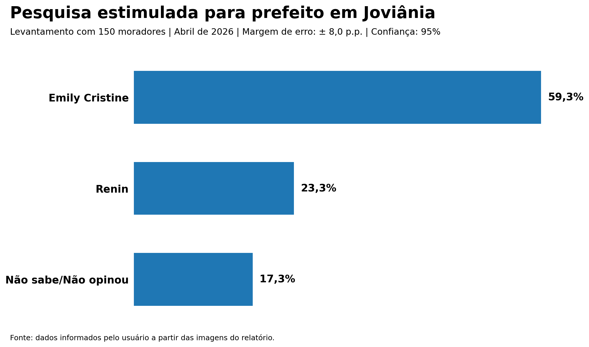 O levantamento foi realizado no dia 07 de abril de 2026, com 150 moradores de Joviânia, apresentando margem de erro de ± 8,0 pontos percentuais e nível de confiança de 95%.