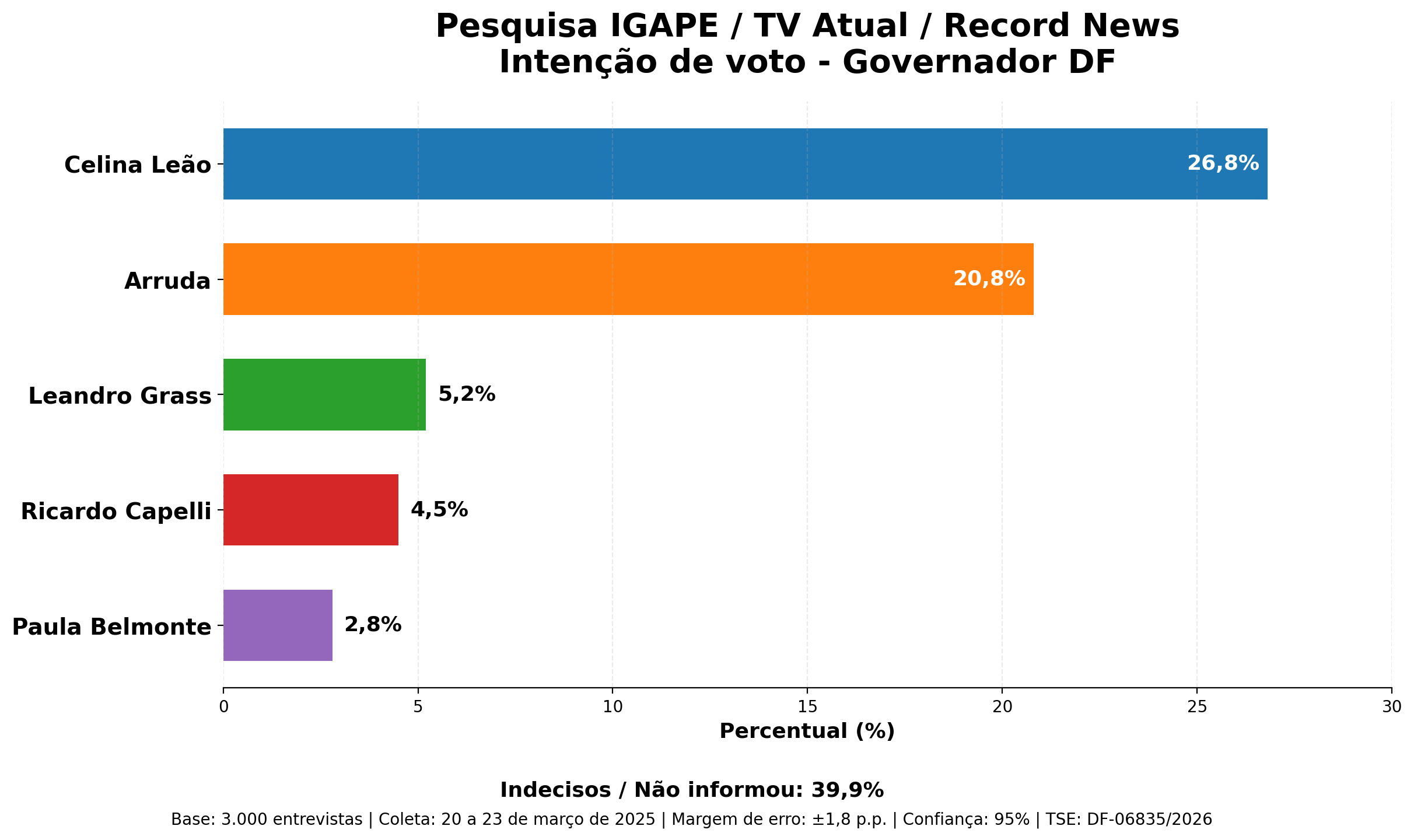 A mais recente pesquisa eleitoral do Instituto Gazeta de Pesquisas (IGAPE), encomendada pela TV Atual / Record News e registrada no Tribunal Superior Eleitoral sob o nº DF-06835/2026, mostra um cenário de dianteira para a Governadora Celina Leão na corrida pelo Governo do Distrito Federal. No levantamento, ela aparece com 26,8% das intenções de voto,
