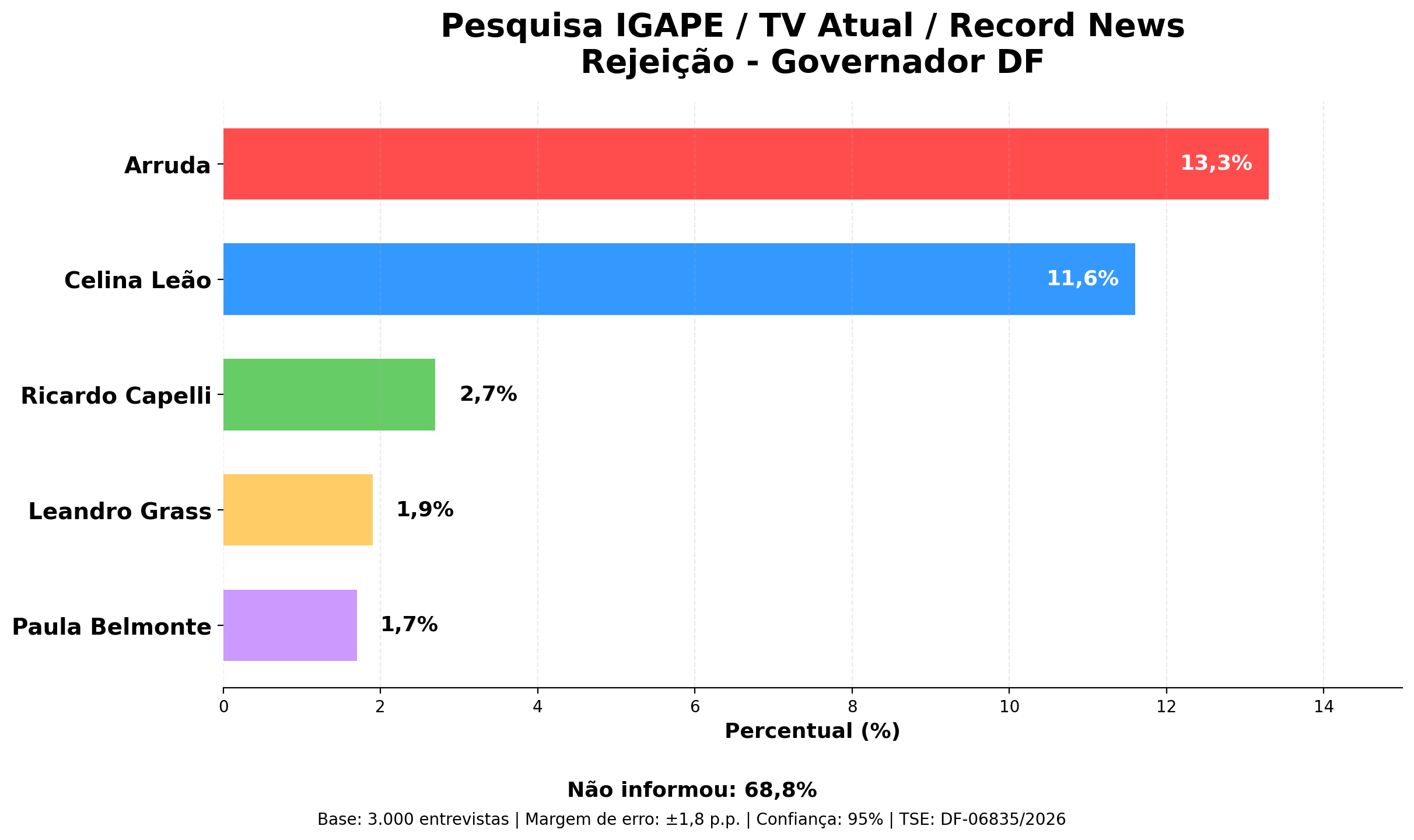 Outro dado importante do levantamento é o índice de rejeição. Na pergunta sobre em qual nome o eleitor não votaria de jeito nenhum para governador do Distrito Federal, Arruda aparece com 13,3%, seguido de Celina Leão, com 11,6%. Na sequência vêm Ricardo Capelli, com 2,7%, Leandro Grass, com 1,9%, e Paula Belmonte, com 1,7%. Já 68,8% não informaram rejeição a nenhum dos nomes apresentados. Esse dado sugere que, apesar de haver liderança na intenção de voto, ainda existe grande margem para disputa de imagem e consolidação eleitoral.