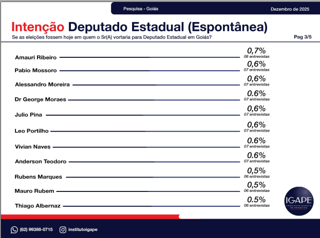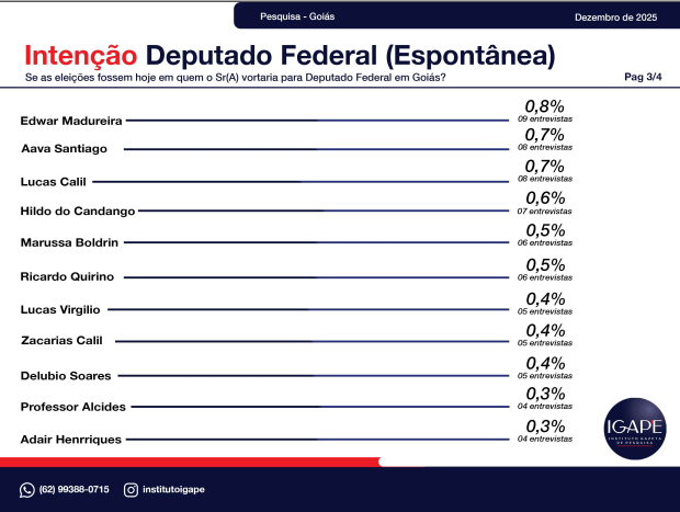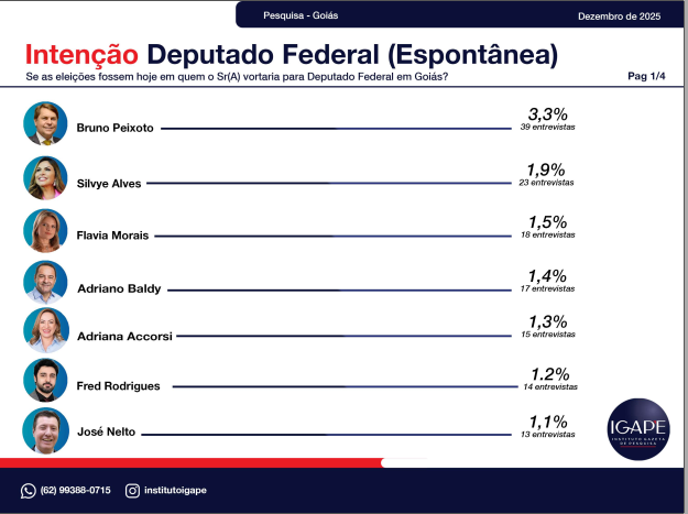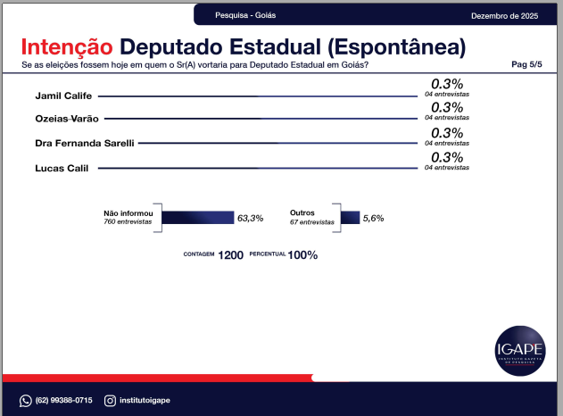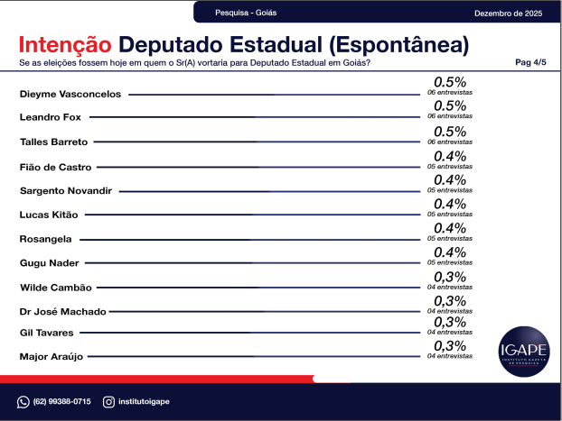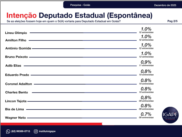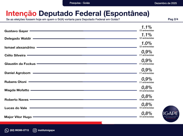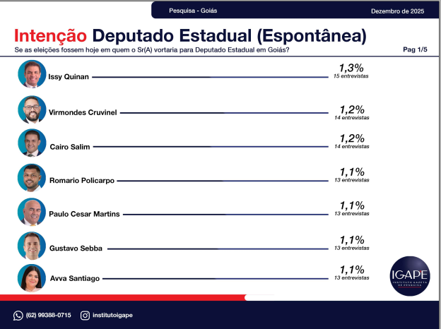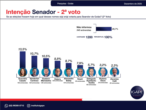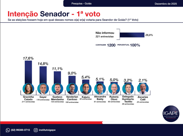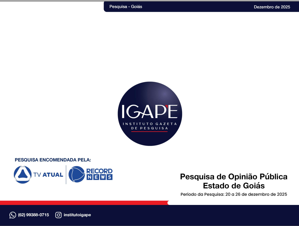 A pesquisa eleitoral realizada pelo Instituto Gazeta de Pesquisas – IGAPE, encomendada pela TV Atual / Record News, revela um retrato atualizado do cenário político no estado de Goiás e aponta tendências importantes para as eleições de 2026. O levantamento, feito entre os dias 20 e 26 de dezembro de 2025, entrevistou 1.200 eleitores em 56 municípios, com margem de erro de ±2,5 pontos percentuais e 95% de confiança.