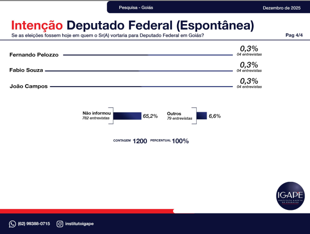 - Para Deputado Federal, quem lidera é o atual Presidente da Alego, e 65,2% não sabem ou não responderam.