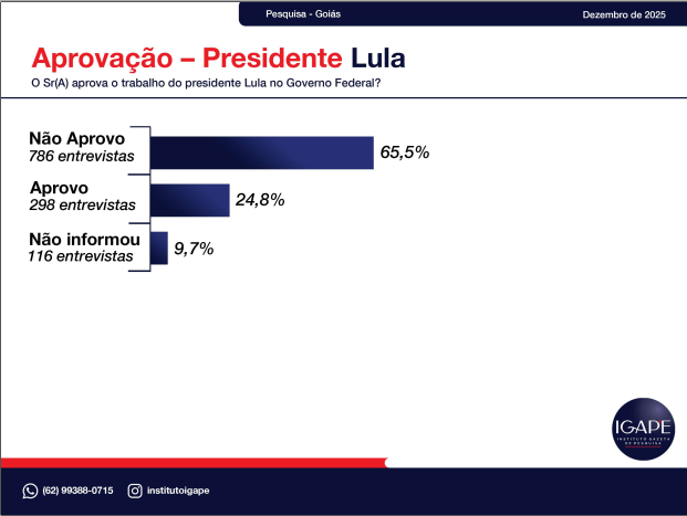 Os dados mostram que Caiado mantém um patamar de aprovação incomum no cenário nacional, enquanto Lula enfrenta rejeição majoritária no estado.