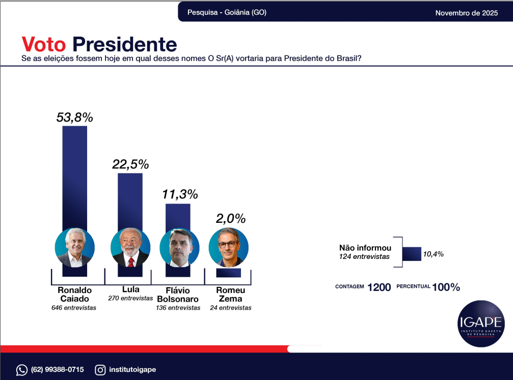 - Ronaldo Caiado domina o cenário estadual e lidera com folga ao testar para presidente.