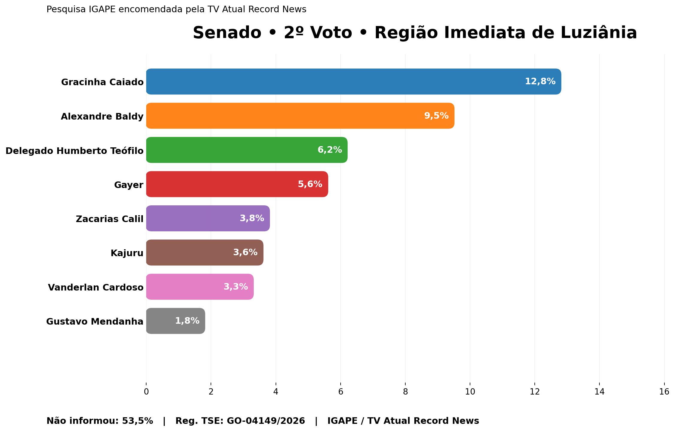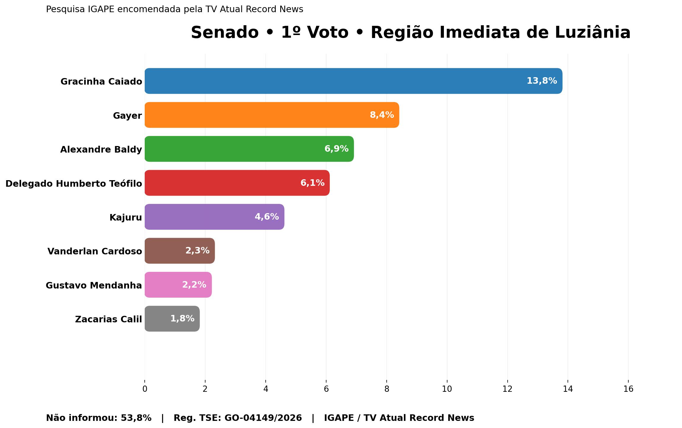 para o Senado, Gracinha Caiado lidera com 13,8%, seguida por Gayer, com 8,4%, e Alexandre Baldy, com 6,9%. Na sequência aparecem Delegado Humberto Teófilo (6,1%), Kajuru (4,6%), Vanderlan Cardoso (2,3%), Gustavo Mendanha (2,2%) e Zacarias Calil (1,8%). O dado mais impactante, porém, é o volume de entrevistados que não informaram voto: 53,8%.