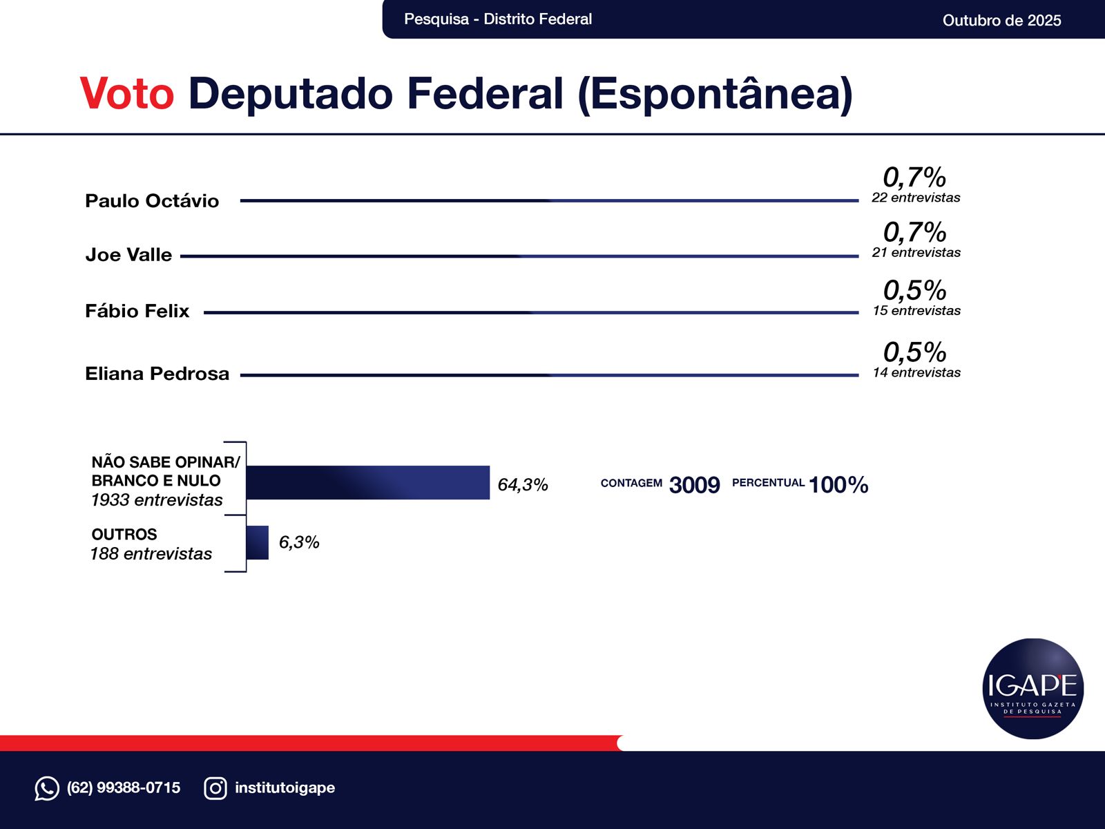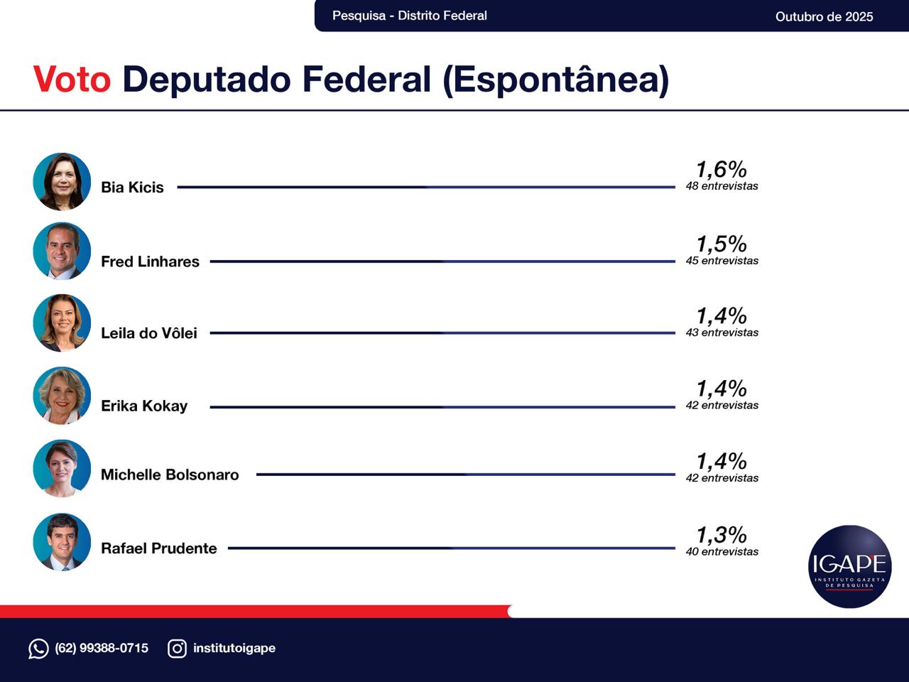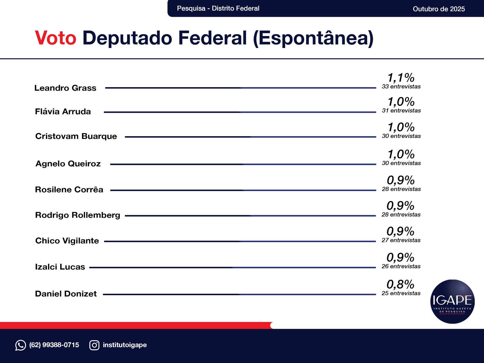 Brasília (DF) – O Instituto Gazeta de Pesquisas (IGAPE) divulgou o mais recente levantamento de intenção de voto espontânea para Deputado Federal no Distrito Federal, realizado em outubro de 2025.