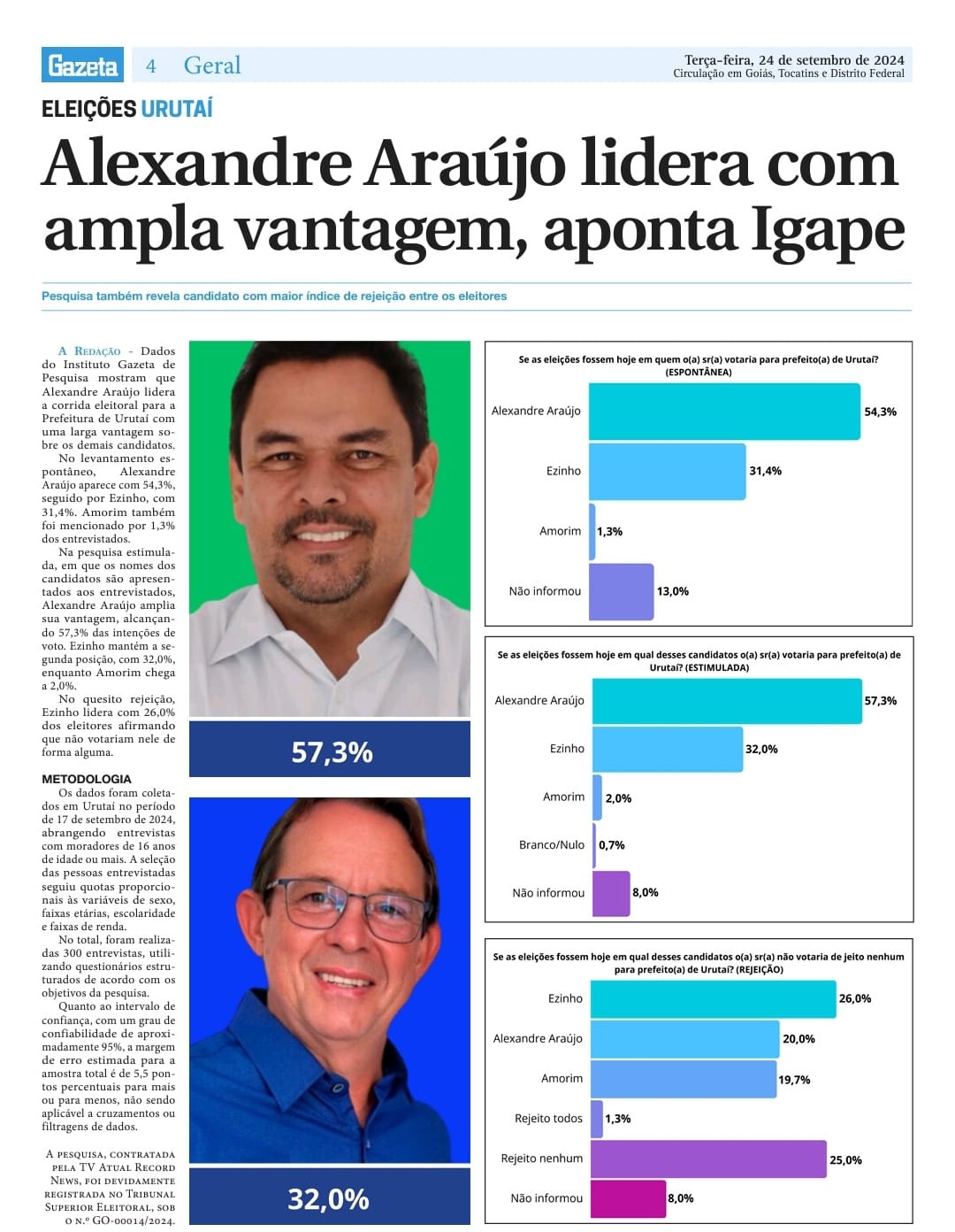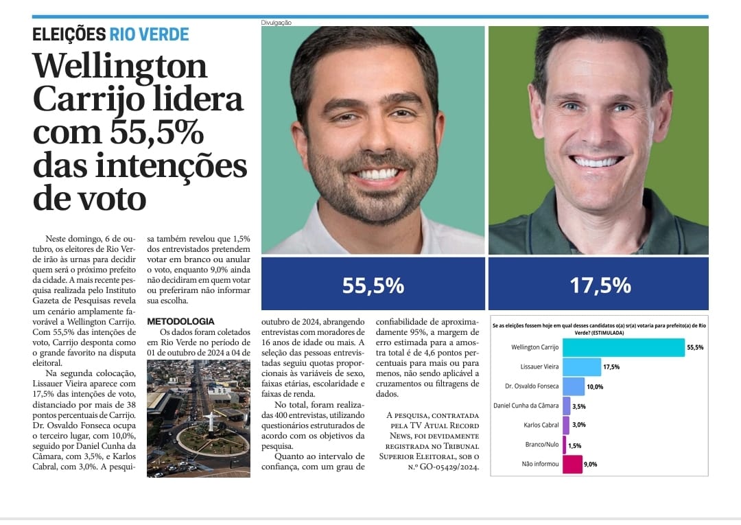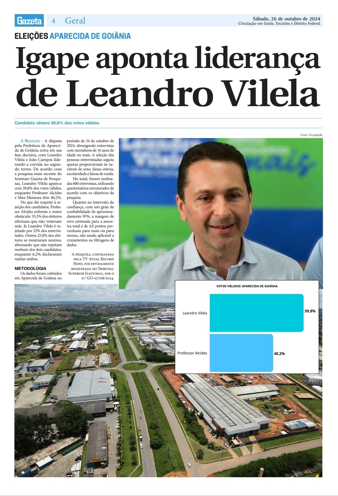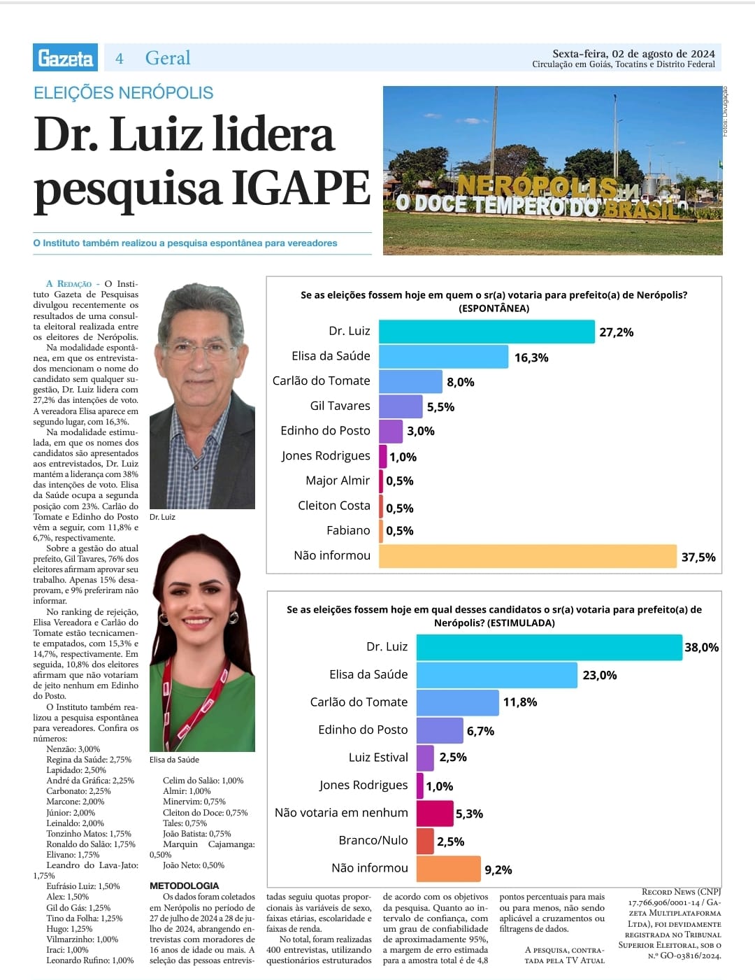 O Instituto Igape é referência em pesquisas eleitorais em Goiás, com histórico de precisão e compromisso com a verdade. O Igape é o Instituto que realiza pesquisas para a TV Atual, afiliada da Record News em Minas Gerais e Goiás, o instituto combina rigor metodológico com profundo conhecimento da realidade local.