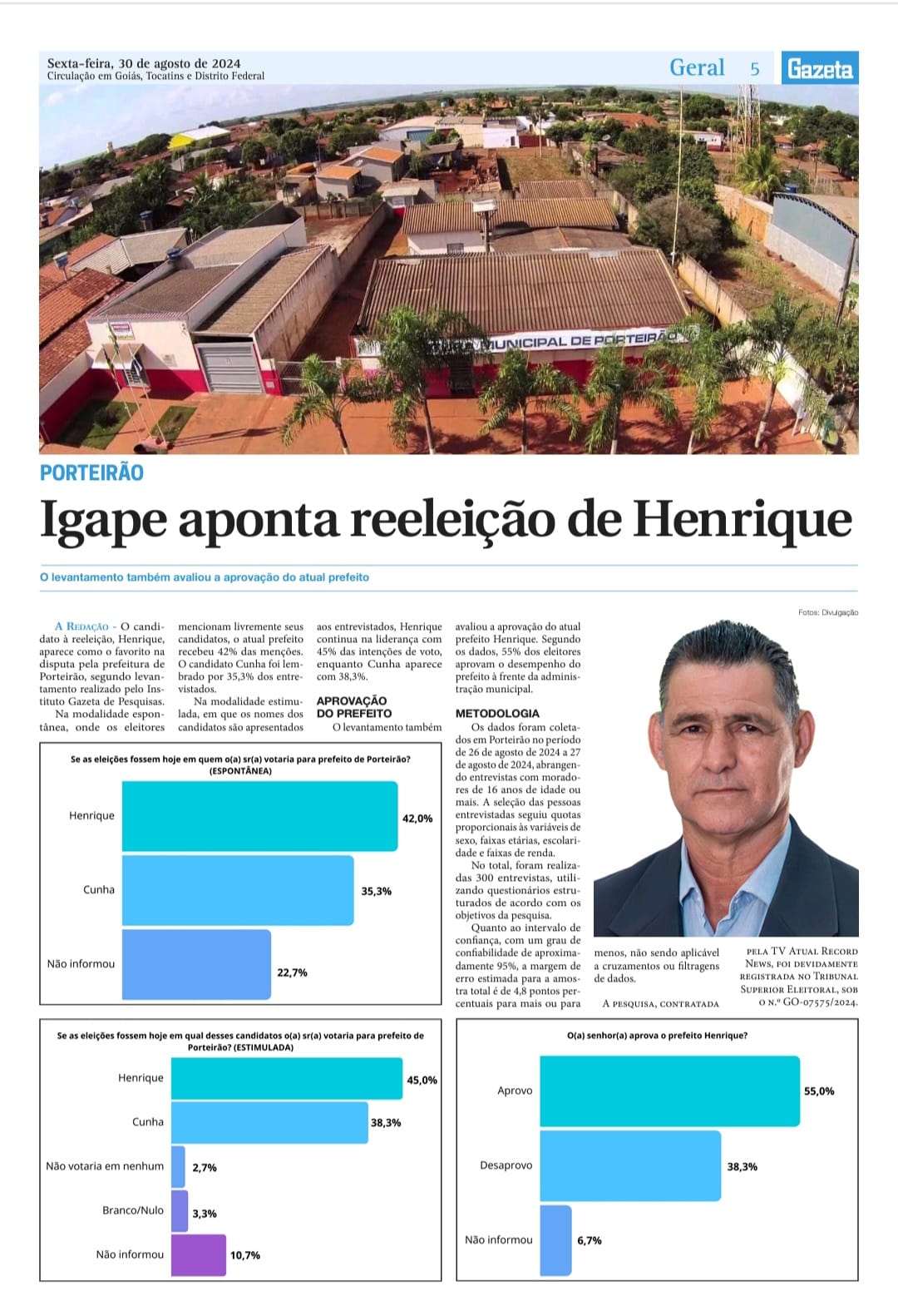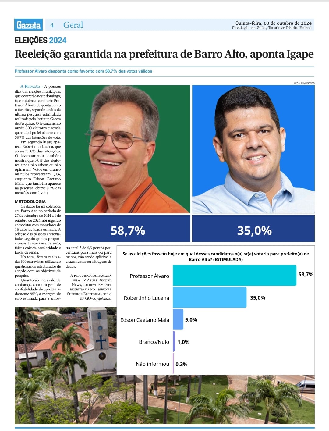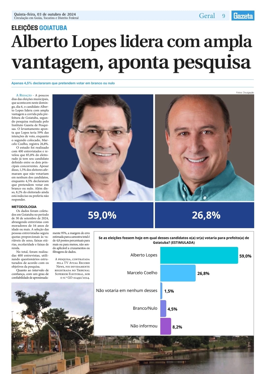 O Instituto Igape é referência em pesquisas eleitorais em Goiás, com histórico de precisão e compromisso com a verdade. O Igape é o Instituto que realiza pesquisas para a TV Atual, afiliada da Record News em Minas Gerais e Goiás, o instituto combina rigor metodológico com profundo conhecimento da realidade local.