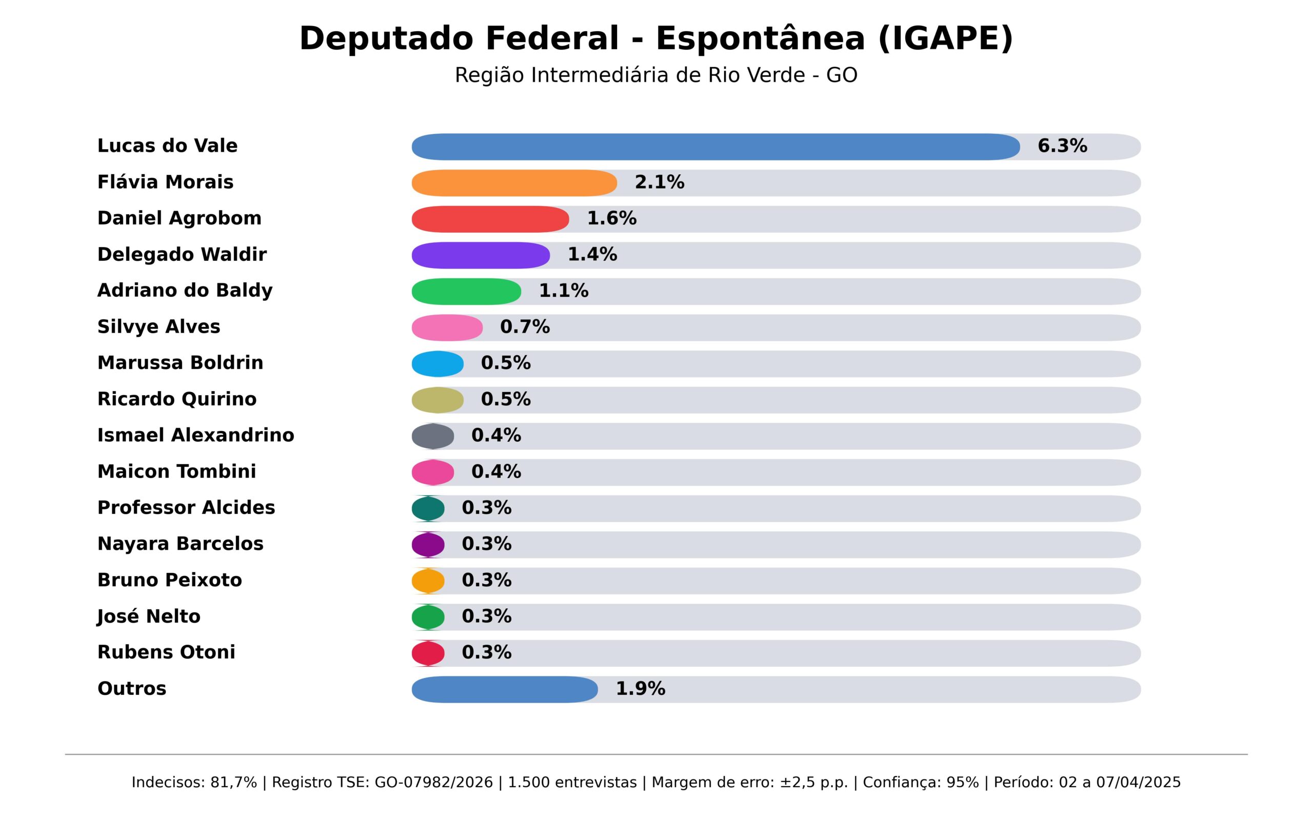A mais recente pesquisa do Instituto Gazeta de Pesquisas (IGAPE) para deputado federal na Região Intermediária de Rio Verde (GO) mostra um cenário de dianteira para Lucas do Vale, que aparece com 6,3% das menções no levantamento espontâneo.