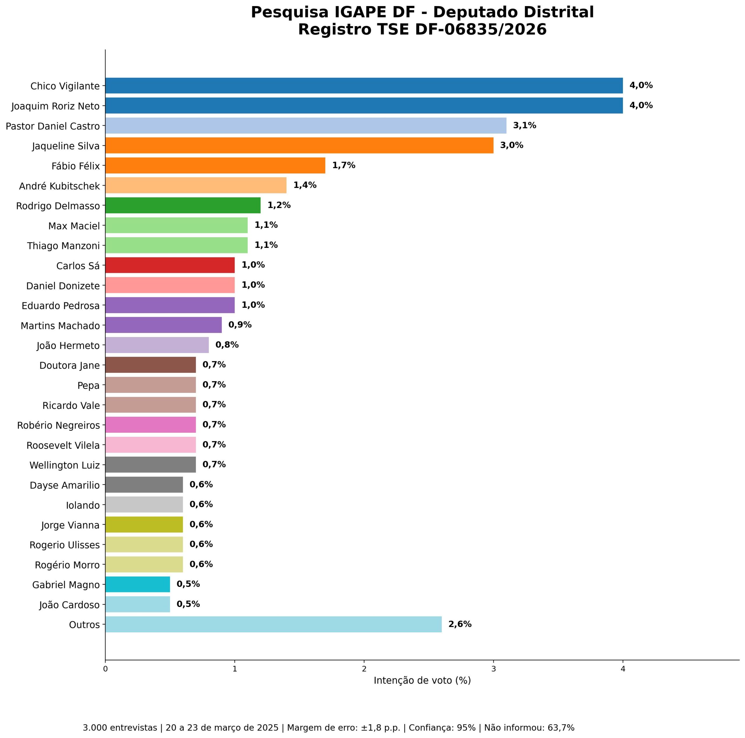 O dado que mais chama atenção é a forte fragmentação da disputa. Na ponta, aparecem Chico Vigilante e Joaquim Roriz Neto, ambos com 4,0% das intenções de voto. Logo atrás vêm Pastor Daniel Castro, com 3,1%, e Jaqueline Silva, com 3,0%. Na sequência, surgem Outros, com 2,6%, e depois um bloco de nomes bastante próximos entre si, mostrando que o quadro ainda está em aberto e com grande espaço para movimentação política.