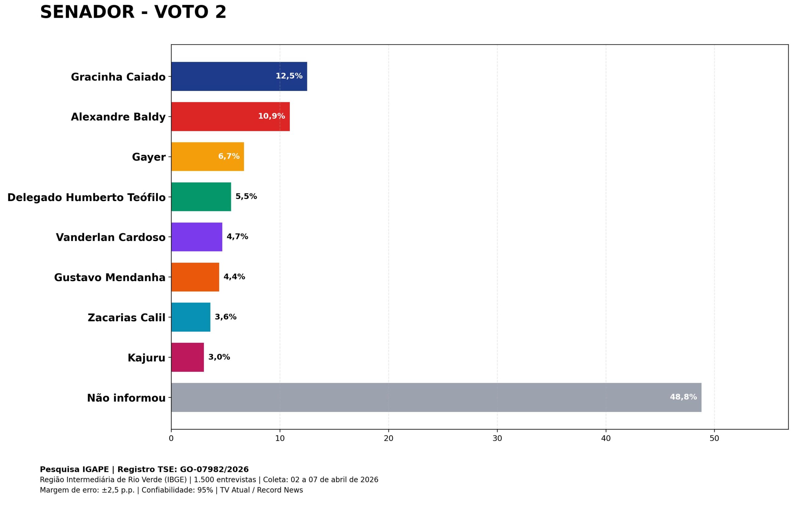 O levantamento está registrado no Tribunal Superior Eleitoral sob o nº GO-07982/2026 e ouviu 1.500 eleitores entre os dias 02 e 07 de abril de 2026, com 95% de confiança e margem de erro de ±2,5 pontos percentuais .