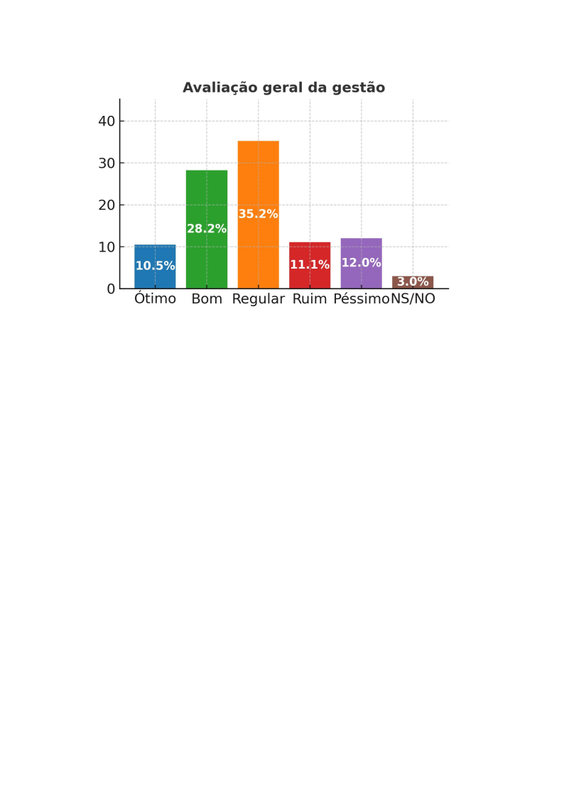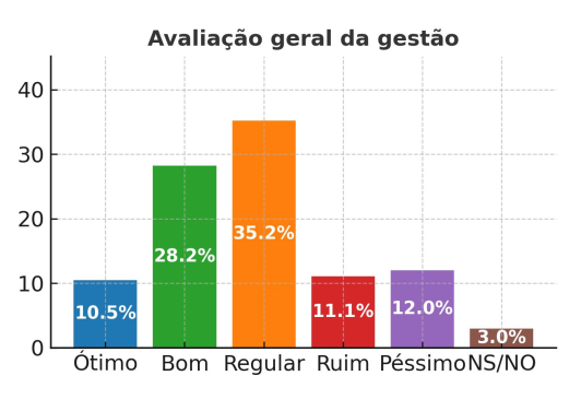 Somando os índices de “ótimo”, “bom” e “regular”, 73,9% dos entrevistados veem a administração de forma positiva ou neutra. Apenas 23,1% consideram a gestão “ruim” ou “péssima”.