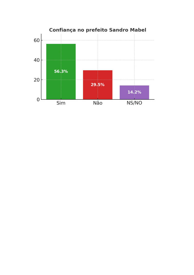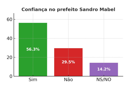 Mais da metade dos entrevistados (56,3%) afirmam confiar no prefeito Sandro Mabel. Esse dado é particularmente relevante considerando o curto período de governo e o cenário adverso herdado.