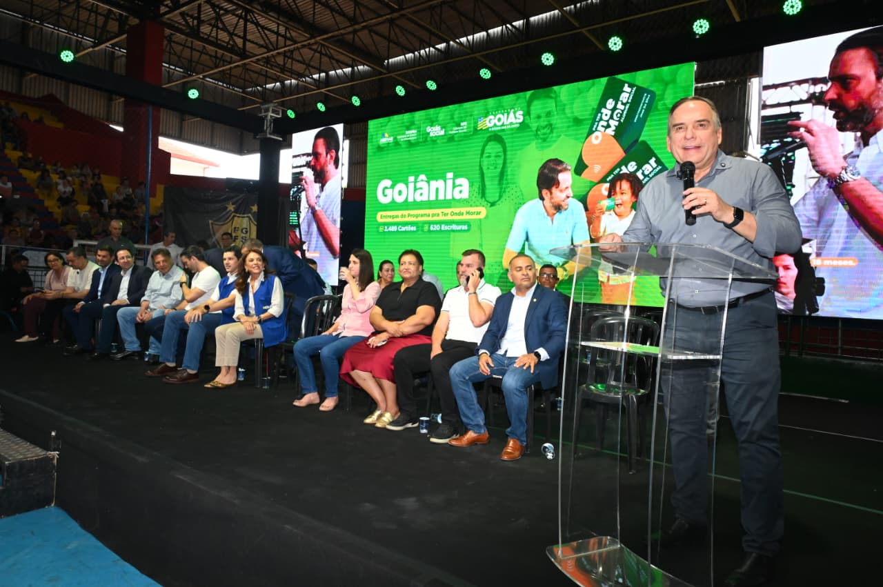 O prefeito de Goiânia, Sandro Mabel, participou na manhã desta quinta-feira (16/10) da entrega de 3.109 benefícios sociais por meio do programa “Pra Ter Onde Morar”, do Governo de Goiás. O evento, realizado no Ginásio de Campinas, contou ainda com a presença do vice-governador Daniel Vilela, da primeira-dama do Estado, Gracinha Caiado, do presidente da Agehab, Alexandre Baldy, além de vereadores e lideranças comunitárias. Foram entregues 2.489 cartões do Aluguel Social e 620 escrituras de imóveis a famílias que há anos aguardavam o documento de suas casas.