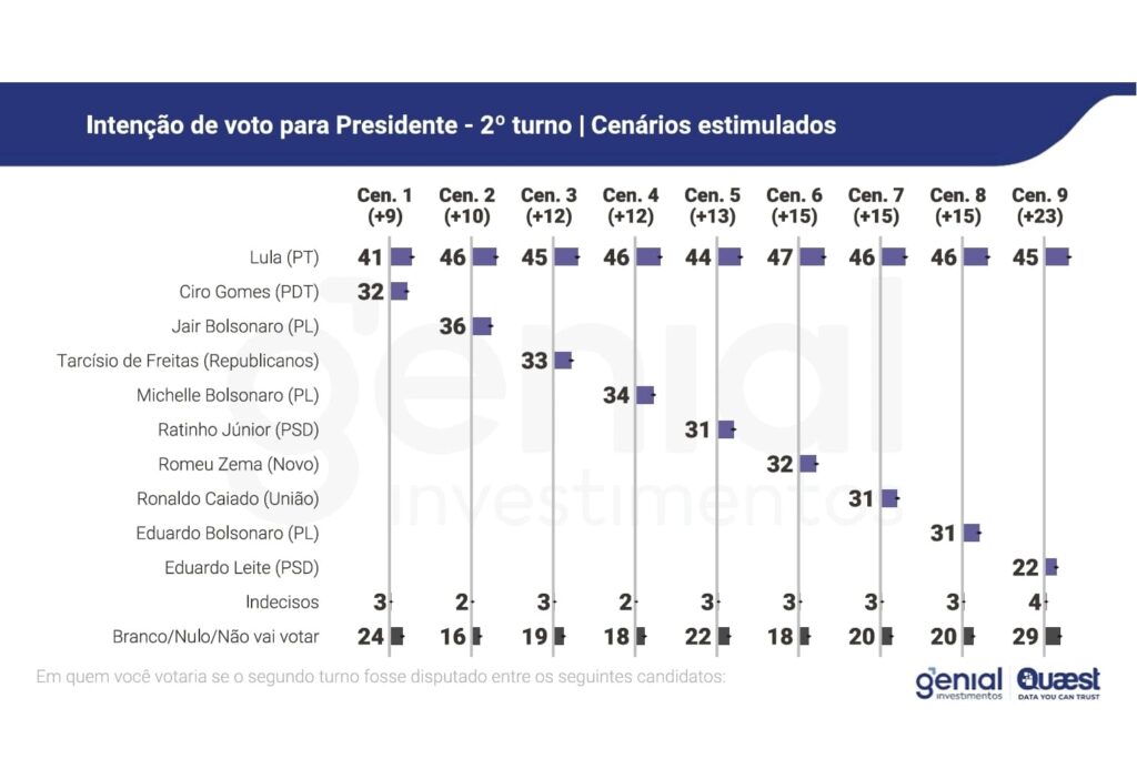 Contra Bolsonaro, Lula tem 44% a 36%; contra Tarcísio, 44% a 33%; contra Michelle, 45% a 34%; e contra Caiado, 45% a 31%.