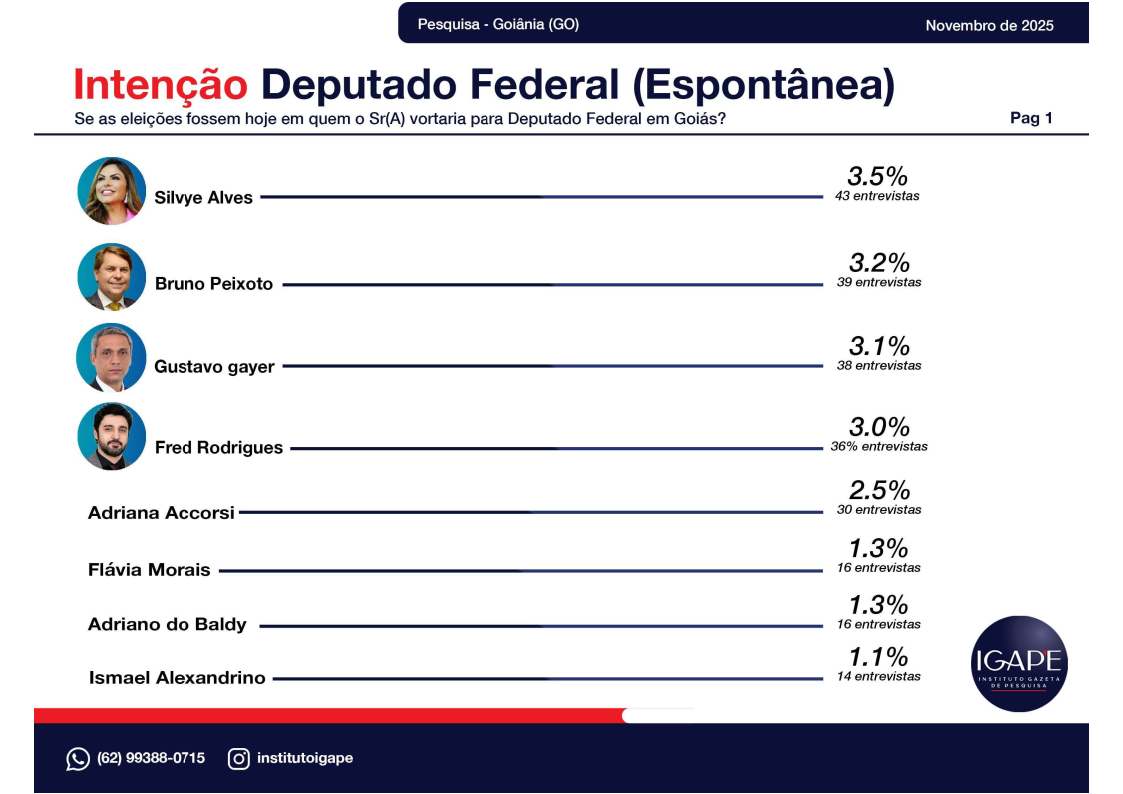 A pesquisa IGAPE confirma que a corrida para deputado federal em 2026 em Goiânia está aberta, fragmentada e sem favoritos, com três grandes forças: