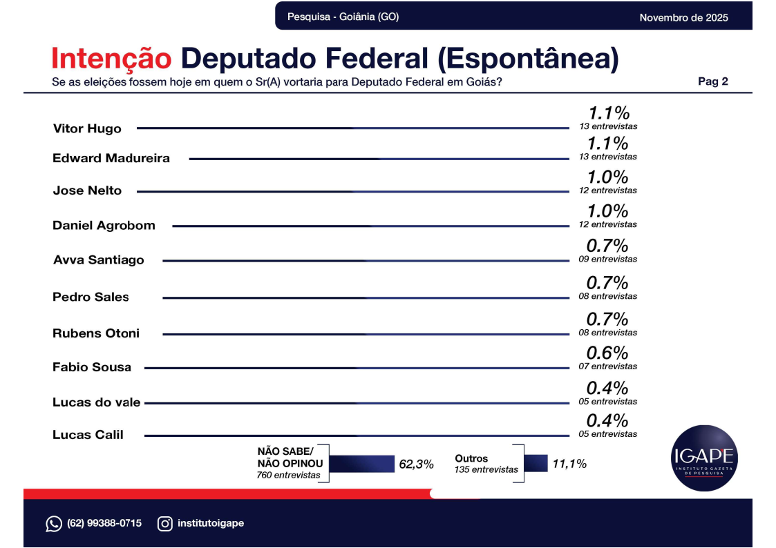 A nova pesquisa espontânea do Instituto Gazeta de Pesquisas (IGAPE) traz um retrato fiel e detalhado da corrida para deputado federal em 2026 entre os eleitores de Goiânia. O levantamento mostra um cenário de baixa definição, forte pulverização e um quadro onde nenhum nome desponta como favorito isolado, algo que historicamente é comum nas eleições proporcionais, mas que, neste ano, aparece ainda mais acentuado.