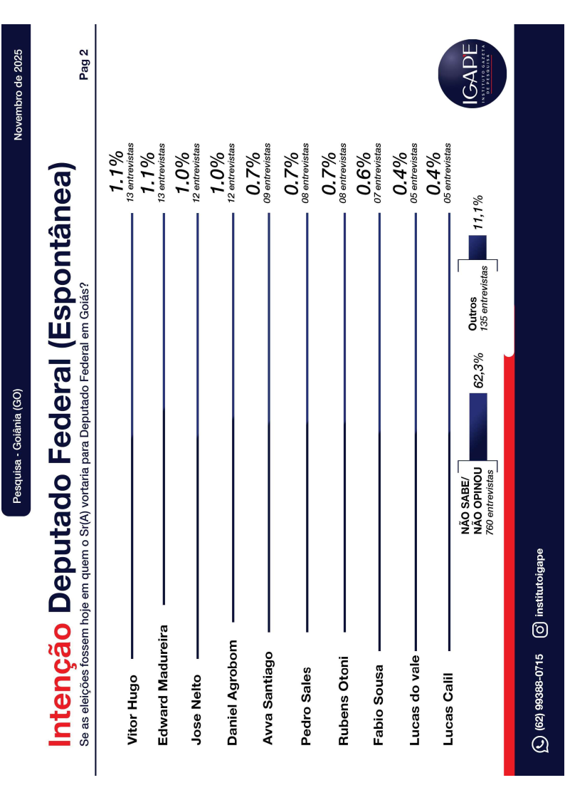 A nova pesquisa espontânea do Instituto Gazeta de Pesquisas (IGAPE) traz um retrato fiel e detalhado da corrida para deputado federal em 2026 entre os eleitores de Goiânia. O levantamento mostra um cenário de baixa definição, forte pulverização e um quadro onde nenhum nome desponta como favorito isolado, algo que historicamente é comum nas eleições proporcionais, mas que, neste ano, aparece ainda mais acentuado.